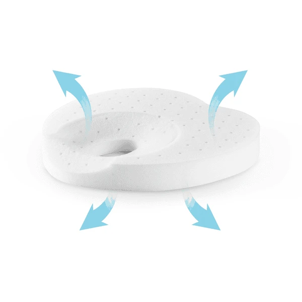Il cuscino di posizionamento, brevettato in Francia, è caratterizzato da un foro centrale e da una forma speciale con un angolo di inclinazione adeguato, che si adatta perfettamente alla forma del cranio del bambino.
