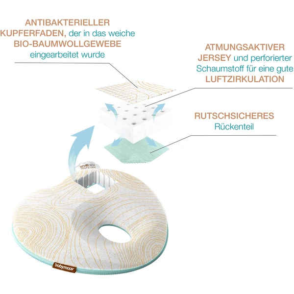 Il Lovenest Natural Care è stato progettato appositamente per i bambini con un sistema immunitario sensibile. Il rame aden F tessuto nella rete di cotone organico elimina il 99,9% dei batteri, riduce gli odori e protegge la pelle dalle infezioni. La tecnologia utilizzata è naturale e non richiede alcun trattamento chimico. Un ulteriore vantaggio del cuscino di posizionamento medico: il Lovenest Natural Care può essere lavato in lavatrice a 30° senza perdere le proprietà antibatteriche del filo di rame. Il cuscino per neonati contro la testa piatta può essere utilizzato fin dalla nascita del vostro bambino.