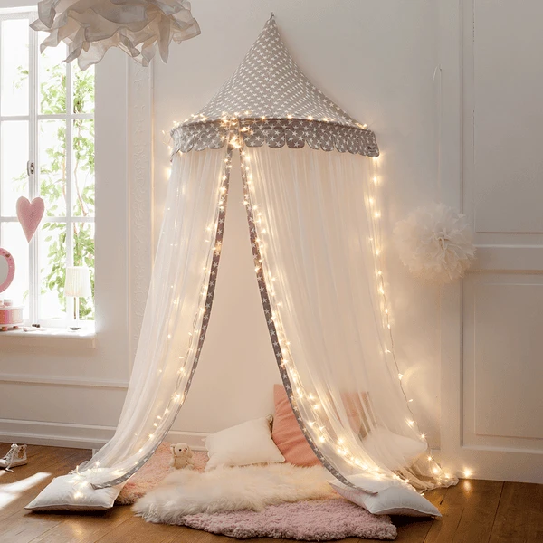 Il materiale superiore del baldacchino è realizzato al 100% in cotone resistente. Il baldacchino è ideale per le culle. Può anche essere montato nella cameretta come tenda gioco o angolo coccole. Il baldacchino da parete forma un semicerchio. Il baldacchino è un accessorio da favola per la stanza della tua bambina.