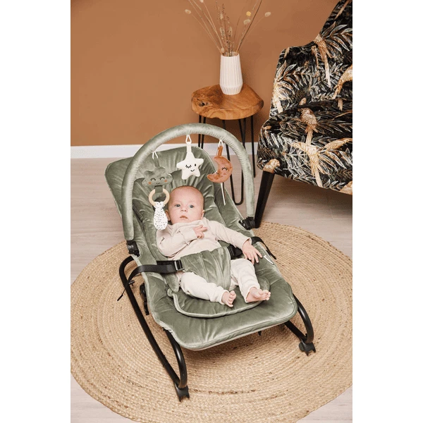 morbido che rende la posizione seduta e sdraiata ancora più confortevole. Come extra, questa sdraietta ha un arco da gioco con giocattoli.