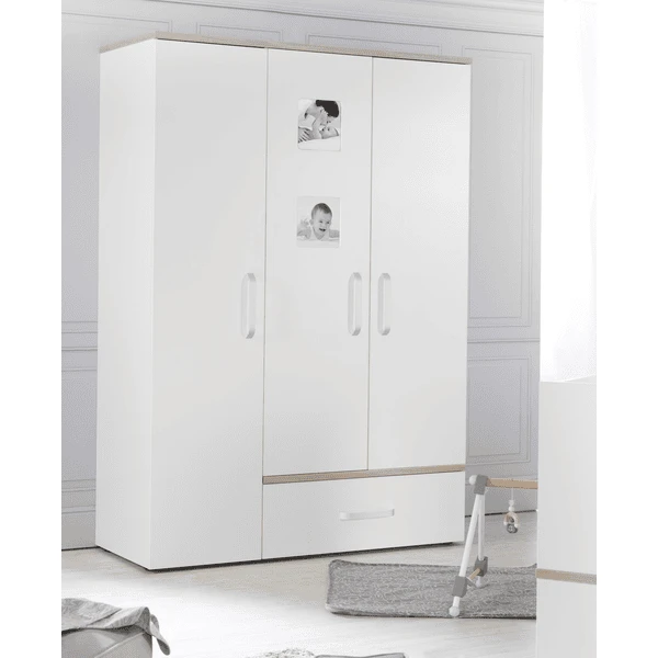 L’armadio ha una pratica divisione ideale per riporre vestiti, libri e giocattoli. L’armadio ad anta battente ha tre ante con tecnologia Soft Close, un ampio cassetto con pratica estrazione totale, un appendiabiti e cinque ripiani. L’armadio per bambini in bianco con pannello superiore e finiture in decoro Luna Elm è dotato di maniglie appendiabiti di alta qualità in Metal l. L’armadio offre uno spazio di stoccaggio supplementare ed è realizzato in truciolato rivestito in melamina, particolarmente resistente.