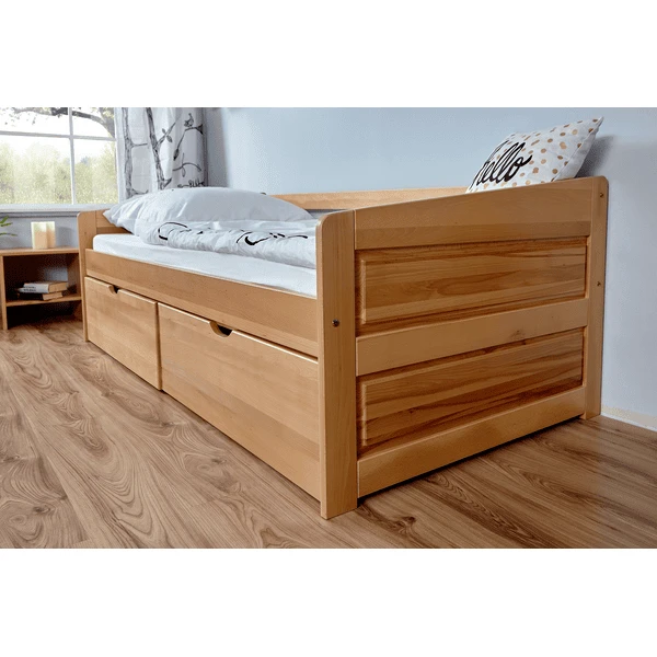 Il divano letto Micki è l’alternativa perfetta al letto normale nella camera dei bambini e dei giovani. Offre una normale superficie sdraiata su cui è meravigliosamente rilassante, ma può essere utilizzata anche come seduta per più persone grazie agli schienali. L’intero letto è realizzato in faggio massiccio e colpisce per la sua elevata stabilità e capacità di carico.